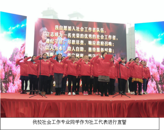 公司3044永利集团有限公司社会工作专业的33名同学在系主任常岚老师以及罗竖元、罗艳萍和蒋星梅老师的带领下参加了此次社会工作宣传推介活动,其中三十名同学作为本次推介活动的社工代表,在活动中进行庄严的社工宣誓仪式。