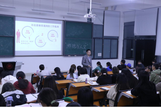 首先,胡老师以当前历史课教师的就业形势为切入点,提出了新教师入职必须具备的专业素养:务实和学习,启示同学们要做好职业规划,找准职业定位,既不妄自菲薄也不好高骛远。随后,胡老师围绕“认识核心素养、认识课程标准、课堂环节处理、教学技巧建议”四个方面来进一步分析和讲解如何上好一堂历史课,在教学经历分享中他强调同学们要具有与时俱进的专业教师能力,要将人文学科与自然学科思维相结合,创新教学方式,同时自觉提高专业能力和职业素养,适应当今复合型人才要求。