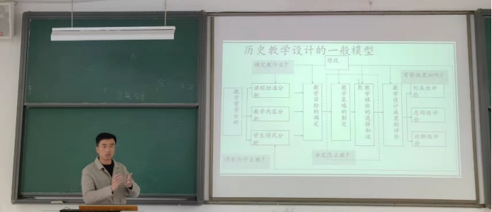 最后,老师向我们讲述了如何进行教学设计。在课前系统部分,我们要研究课标、教学立意、教材分析、学情分析、教学目标,重点难点、教学方法、课前准备、课时安排;在课堂教学部分,我们要注重新课导入、讲授新课、员工活动、教师活动设计意图、本课小结、板书设计;在课后系统部分要注重教学反思、课后探究、作业反馈、拓展资料、参考文献。接着,老师主要以《甲午中日战争与八国联军侵华》一课和其他的课堂案例为我们进行分析讲解了如何进行教学设计,给我们提了很多好的建议,让我们避免走入一些教学设计的误区。通过张老师的讲座,同学们学到了许多进行教学设计的经验与方法,受益颇深。