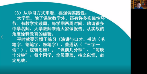 刘老师结合自己从教多年的经验,从“我们准备度过一个怎样的大学四年?”、大一新生规划、如何养成良好的学习习惯并掌握正确的学习方法、历史系员工学习方法、记好笔记的方法、记忆方法等几个方面为大一新生讲述良好学习习惯养成的意义及历史系员工学习的方法,刘老师还对2022级历史学新生寄予希望,希望他们从现在抓起,养成良好的学习习惯、记课堂笔记和读书笔记的习惯以及独立思考的精神。与会同学均表示从中受益匪浅,以后会养成良好的学习习惯,掌握正确的学习方法,夯实基础知识,培养创新思维能力,努力成为祖国未来合格的接班人。