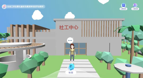 此次比赛依托陆由社会工作仿真对抗平台软件进行,模拟某城市民政局面向多家社工机构招投标的过程。软件构建了3D全景立体真实的社区,场景丰富,包括政府大楼、社工机构、医院、公司、公安局、福利院、党建中心、操场、停车场、体育中心等。员工分为14组,分别模拟一家社工机构进行投标,组内实现在线协作,组与组之间实现在线竞争对抗,通过多个回合的投标来实现机构的可持续运营与发展。