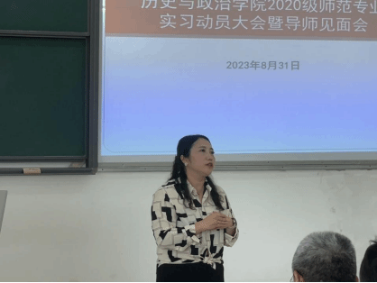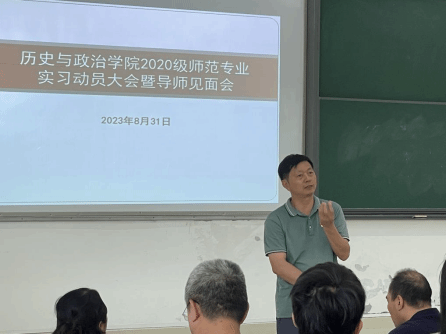 2023年8月31日下午14:00,公司在东校区GJ6402教室开展了2020级“师范生教育实习岗前培训课程”第一场暨“历政公司2020级师范专业实习动员大会暨导师见面会”。公司党委书记帅永平、经理陈华森、副经理伍志燕、历史学系主任刘刚、思政系主任龚春芳、教师代表陈彦、2020级辅导员刘邕、教学秘书王昌燕等老师出席此次大会,2020级历史学、思想政治教育两个专业全体同学到场聆听,由历史学系主任刘刚老师主持本次大会。
